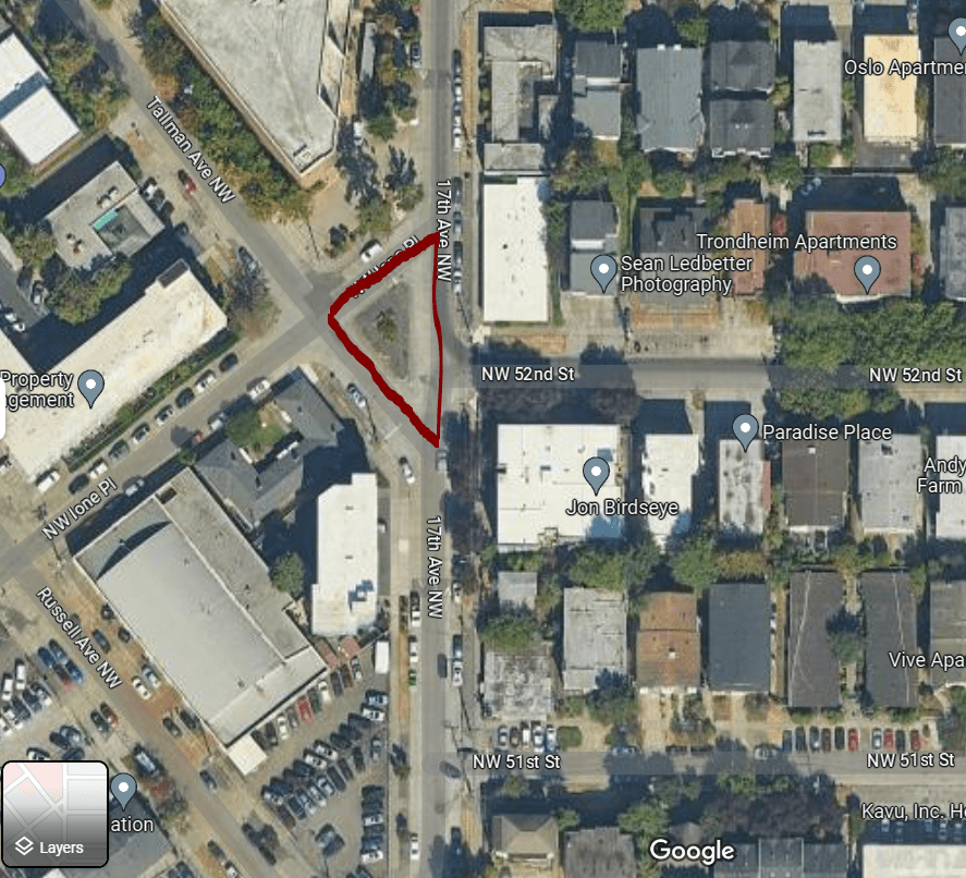 The future of the street needs to start at a central point and spread: the current intersection of 17th, 52nd, Tallman, and Ione. This is a unique intersection as diagonal streets meet grid-oriented streets. Currently there is an island that serves as a traffic barrier and pedestrian stopping point, but it is a poor setup and leads to constant confusion for cars and pedestrians both as they try to cross the extra wide street where traffic approaches from 6 different directions.